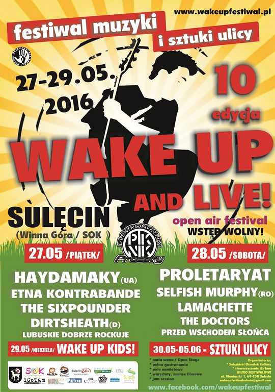 Sulęciński Ośrodek Kultury oraz Stowarzyszenie Strefa Działań Twórczych „iCoTam” organizatorzy WAKE UP and LIVE – Festiwal Muzyki i Sztuki Ulicy zapraszają wszystkich na niezwykłą przygodę z muzyką, kulturą i sztuką, która rozpocznie się 27 maja 2016 roku w Sulęcinie.