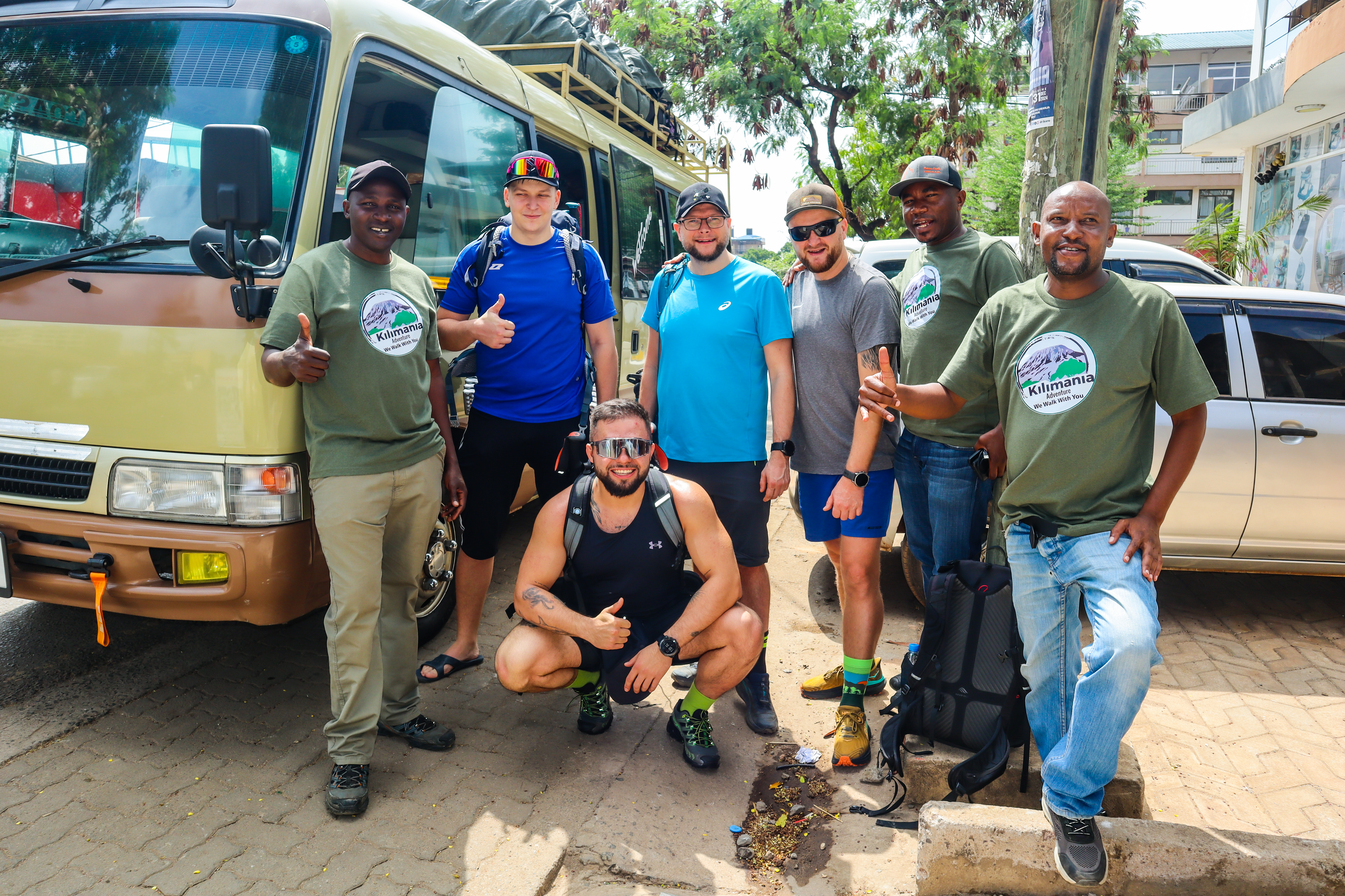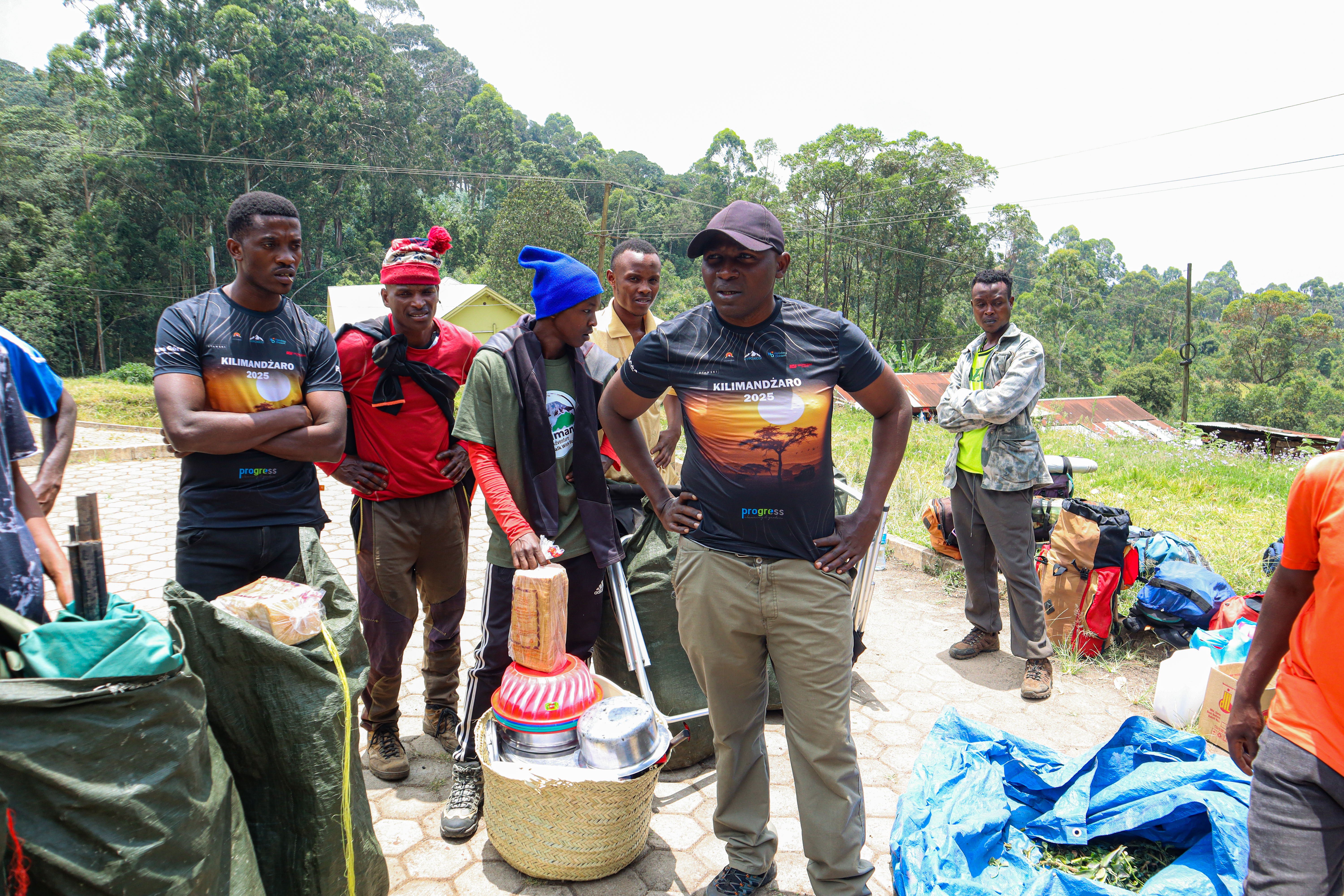 Pierwszy etap podróży samolotem do Paryża minął szybko w małym, zgrabnym Airbusie A220-300. Dolecieliśmy prawie punktualnie, co miało duże znaczenie, bo na przesiadkę do samolotu do Tanzanii mieliśmy niecałą godzinę. Niestety, nie spisała się obsługa naziemna lotniska, bo przez 20 minut czekaliśmy na podstawienie „rękawa” do wyjścia z samolotu. Kolejne 15 minut w kolejce do oprawy paszportowej i zrobiło się nerwowo. Do następnego terminala na Paryż Charles de Gaulle musieliśmy z Michałem biec jakieś 1,5 km. Zaliczyliśmy więc przymusowy trening :) Ostatecznie zdążyliśmy przez zamknięciem boardingu i mogliśmy zająć nasze miejsca w dużym, międzykontynentalnym Airbusie A350-900. Podróż z międzylądowaniem na Zanzibarze trwała długich 12 godzin. Na lotnisku Kilimandżaro byliśmy 15 minut po północy czasu wschodnioafrykańskiego, czyli o 22.15 naszego czasu. Formalności związane z wizą i odprawą zajęły nam blisko godzinę. Przed lotniskiem czekał na nas nasz przewodnik i właściciel firmy organizujących wyprawę Saby. Niezwłocznie wyruszyliśmy w ostatni etap podróży do miasta Moshi. Byliśmy na miejscu po 2 nad ranem – 24 godziny od wyjazdu z Sulęcina. Po 5 godzinach snu ok. 8 nad ranem obudziło nas tętniące życiem miasto. Na ulicach setki tuk-tuków jadących w różne strony, przekrzykujący się sprzedawcy, reklamy puszczane z głośników i wszechobecny dźwięk klaksonów. Tak głośnej ulicy jak afrykańska wcześniej nie spotkałem. Po dość obfitym hotelowym śniadaniu (groszek z marchewką w sosie, pieczone banany i przepyszne mango, które razem z awokado będą nam towarzyszyć przez cały pobyt w Tanzanii) spotkaliśmy się z dwoma pozostałymi członkami wyprawy – Tomaszem z Zielonej Góry i Piotrem z Warszawy i o godz. 10 z naszymi przewodnikami oraz porterami. Porter, to angielskie słowo, które oznacza „tragarz”. W przypadku wejścia na Kilimandżaro porterzy są obowiązkowi dla każdej wyprawy. Rząd tanzański zastrzegł, że na górę można wchodzić tylko z certyfikowaną lokalną firma, a ta musi wynająć ludzi to noszenia całego ekwipunku biwakowego. Biorąc pod uwagę biedę i ograniczone możliwości zarobkowania w Afryce, to doskonały sposób na stymulowanie zatrudnienia. Każdy z naszej czwórki uczestniczący w wyprawie miał przypisanych pod siebie 4 porterów. Dla nas byli to prawdziwi bohaterzy. Pokonywali tą samą trasę co my (oprócz samego ataku szczytowego z wysokości 4600 m na który wyruszyliśmy tylko z przewodnikami), taszcząc na głowach i plecach po 30-35 kg bagaży. Były to nasze torby, namioty, żywność na 6 dni wyprawy i własne rzeczy.