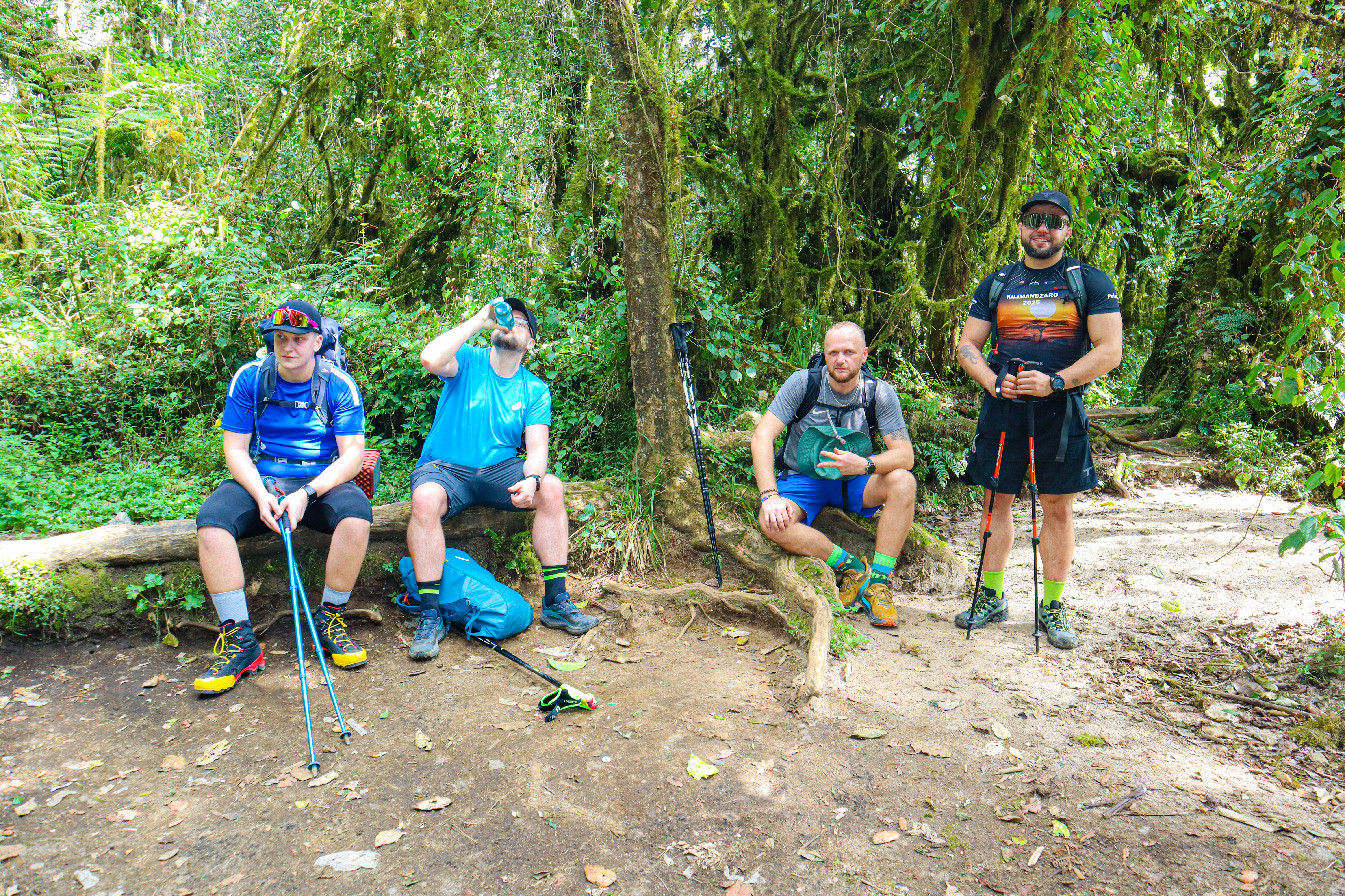 Po dokonaniu wszystkich formalności i przepakowaniu się ok. 13 ruszyliśmy na pierwszy etap wędrówki. Trasa wiodła przez dżunglę. Ścieżka wiła się wśród wysokich drzew, pokrytych lianami i inną zwisającą roślinnością. Słyszeliśmy śpiew ptaków, ale rzadko jakiegoś widzieliśmy. Dość wysoka temperatura, ale także duża wilgotność powodowały, że oblewaliśmy się potem. W plecakach zawsze nieśliśmy zapas wody na cały dzień. Podstawowa zasada, żeby zapobiec chorobie wysokościowej (pierwsze objawy wysokości możemy odczuwać już powyżej 2500 m n.p.m.) to picie przynajmniej 4 l płynów dziennie. Oprócz tego należy dużo jeść, jak najwięcej spać, unikać palenia i picia alkoholu. No i główna zasada naszych tanzańskich przewodników – pole, pole. Po naszemu – wolno, wolno. Na duże wysokości wchodzi się bardzo wolnym tempem, kroczek po kroczku. Nasz organizm ma powoli dostosowywać się do mniejszej dostępności tlenu w powietrzu i niższego ciśnienia.