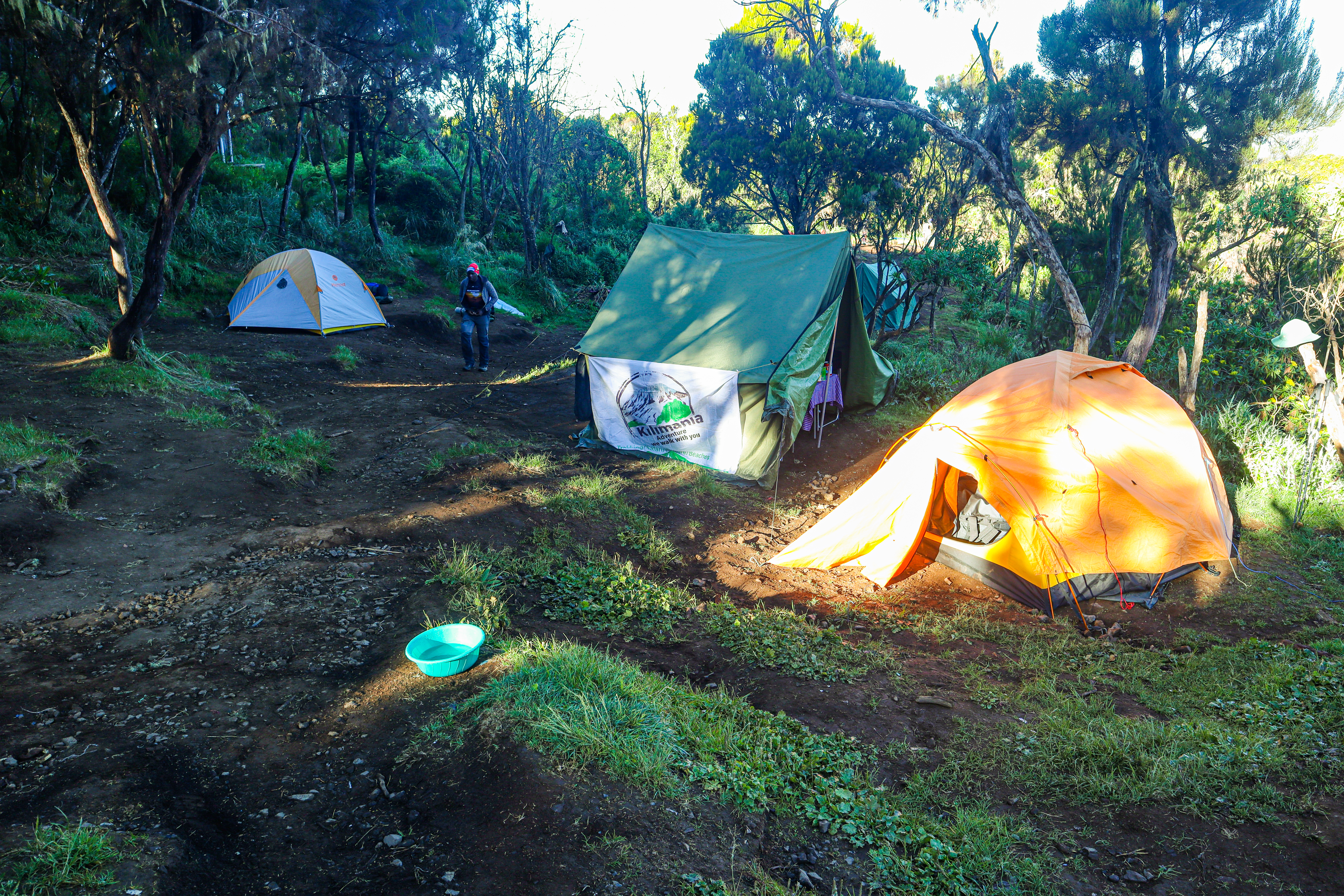 Pomimo deszczu humory nam dopisywały i ok. godz. 18 dotarliśmy do pierwszego obozu Machame Camp. Nasze namioty stały już rozłożone. Po godzinie w specjalnym namiocie jadalnym kucharz zaserwował nam kolację. Każdy posiłek zaczynał się od zupy. Były to zawsze polewki ugotowane z proszku. Zwykle całkiem smaczne. Zapewne ich najważniejszym zadaniem było rozgrzać nasze żołądki. W przypadku właściwego dania nigdy nie mieliśmy powodu do narzekań. Kucharz wspinał się na wyżyny biwakowego gotowania. W pierwszym dniu na kolację dostaliśmy smażoną rybę z ziemniakami z wody i gotowanymi warzywami.