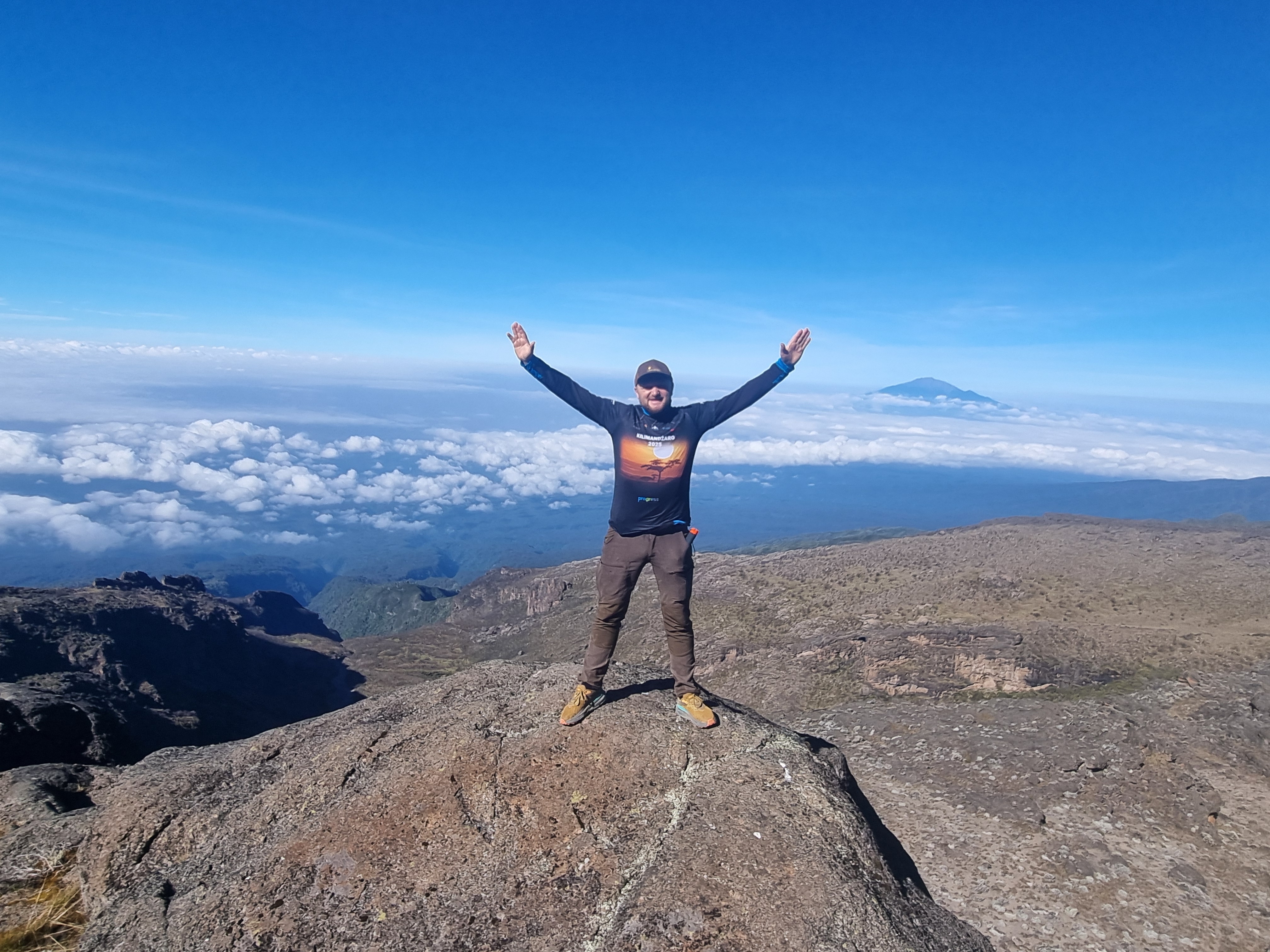 Noc przespaliśmy dużo lepiej niż poprzednią. Mój Garmin wskazał niecałe 5 godzin snu, jednak pozostałe godziny na pewno były sporym odpoczynkiem. Co jednak najważniejsze nie odczuwałem żadnego bólu głowy. Aklimatyzacja zaczęła postępować. Śniadanie zjedliśmy z dużym apetytem. Ok. 8 ruszyliśmy pod największą i najbardziej stromą jak dotąd ścianę. Z jednym z kolegów porównaliśmy ją do wejścia na Świnicę od strony Zawratu. Tu jednak nie było żadnych łańcuchów i klamr. Trzeba było trzymać się skał, bo od przepaści dzieliło nieraz pół kroku. W naturalnych miejscach uchwytu skały były na gładko wyślizgane przez setki tysięcy rąk, które je chwytały przez lata. Po kilku dniach typowego trekkingu byliśmy z tej trasy bardzo zadowoleni. Pogoda dopisywała, humory i nastawienie również. Czułem się pełny sił i szczęśliwy. Widoki były oszałamiające. Stałem nad chmurami na skale i chłonąłem piękno gór. Chciałem, żeby czas się zatrzymał. Przede mną daleko rozciągający się ląd zasnuty chmurami. Z drugiej strony monumentalny, dostojny Kilimandżaro, niemal samotnie górujący wśród afrykańskich równin. Natura niegdyś w gwałtowny sposób przez potoki lawy wyniosła w górę wulkan Kibo, który teraz jest celem wypraw ok. 50 tys. turystów rocznie.