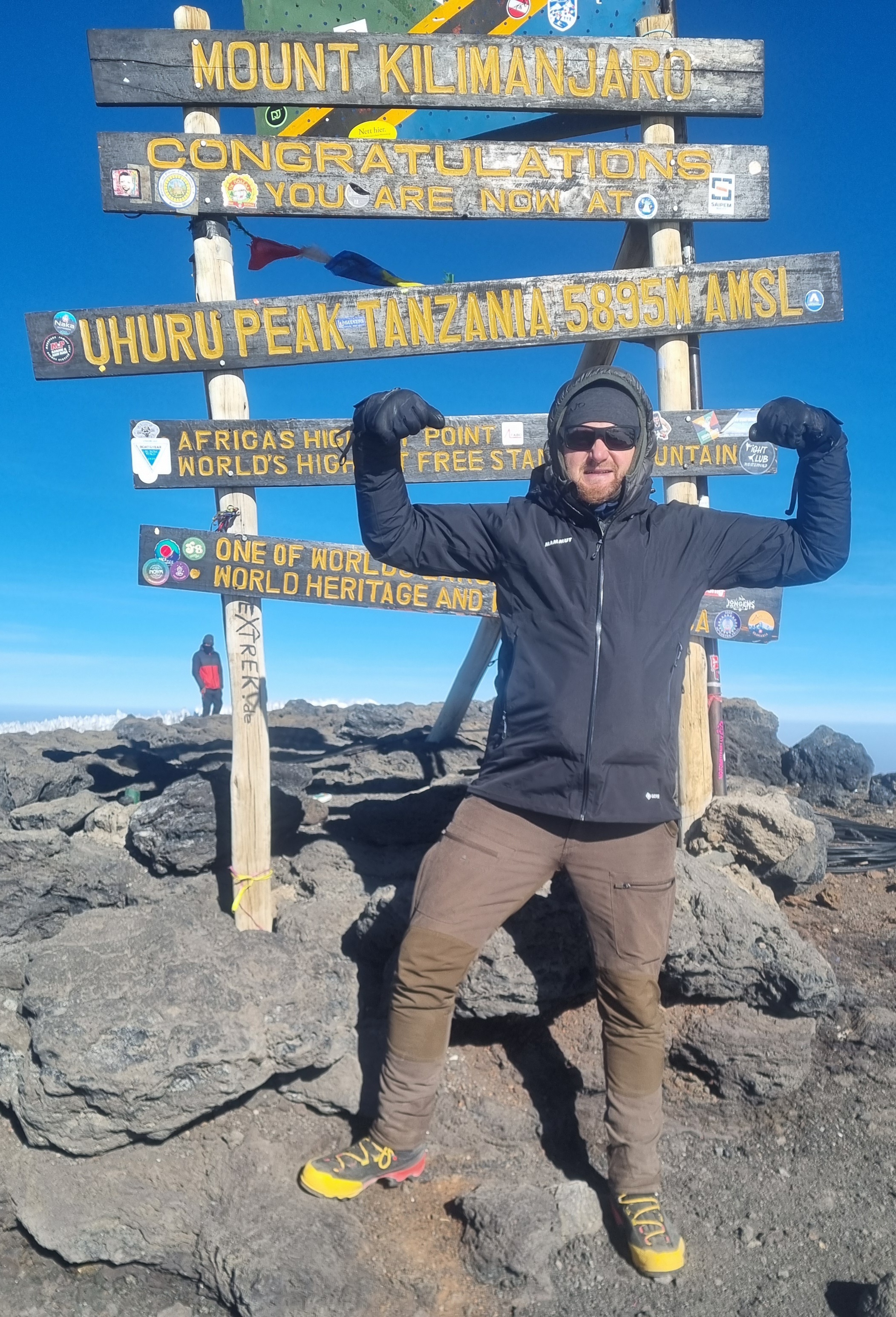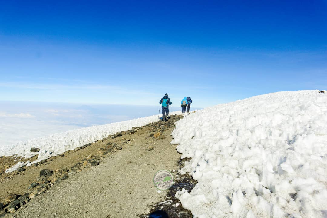 Ze Stella Point zostało już tylko 40 min wspinaczki na Uhuru Peak. Nie wiem dlaczego, prawdopodobnie pod wpływem adrenaliny ostro ruszyłem pod górę, nie oglądając się za siebie. Za mną jak cień podążał jeden z naszych przewodników – Izmael. Ostatnie podejście było łagodniejsze. W połowie drogi weszliśmy w śnieg, który był jednak sypki, więc buty wspinaczkowe doskonale sobie z nim radziły. Okazało się, że niepotrzebnie dźwigałem w plecaku ważące ok. kilograma raczki. To nie miało jednak dla mnie większego znaczenia. Widząc szczyt leciałem jak na skrzydłach. Ok. 8.20, po 7 godzinach od wyruszenia z obozu, Kilimandżaro było pod moimi stopami, a Afryka pode mną. Do teraz myśląc o tym jestem wzruszony, a wtedy łzy ciekły same – kompletnie nie miałem na to wpływu. Po ochłonięciu i wzajemnych gratulacjach z Izmaelem i przypadkowymi wspinaczami ruszyliśmy do robienia zdjęć. Musieliśmy się stale ruszać, bo temperatura była zdecydowanie poniżej -20 stopni. Reszta ekipy dotarła po ok. 15 minutach. Szczęśliwi, rzuciliśmy się sobie w ramiona. Po serii kolejnych zdjęć grupowych i indywidualnych Saby wręczył mi szampana. Wstrząsnąłem mocno, korek strzelił i już na górze zaczęliśmy świętować nasz sukces. Po blisko godzinie na szczycie ruszyliśmy w dół. Zejście do obozu zajęło mi niecałe 2,5 godziny. Po drodze musiałem wziąć tabletkę przeciwbólową, bo głowa zaczęła mocno doskwierać. Po dojściu do Barafu Camp byłem już naprawdę zmęczony. Ktoś zorganizował ciepłą wodę. Umyłem się i położyłem na 1,5 godziny cennego snu. Po obiedzie spakowaliśmy nasze rzeczy i ok. 15 ruszyliśmy do obozu na wysokości 3950 m. Droga zajęła nam ok 2 h. Dostaliśmy kolację i mogliśmy się położyć. Mój organizm był w pełni zaaklimatyzowany do tej wysokości i spałem ponad 9 godzin. To był mój rekord. Obudziłem się wypoczęty i pełen energii. Po śniadaniu ruszyliśmy do bramy Mweka. Ostatnie 13 km i 2200 m w dół poszły gładko. Pod koniec wędrówki spotkaliśmy przy szklaku najpierw małpy Błękitne, później większe od nich Gerezy. To dopełniło naszego radosnego nastroju. Przy bramie ostatnie pamiątkowe zdjęcia i gratulacje. Nasza przygoda dobiegła końca.
