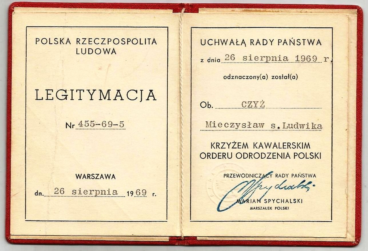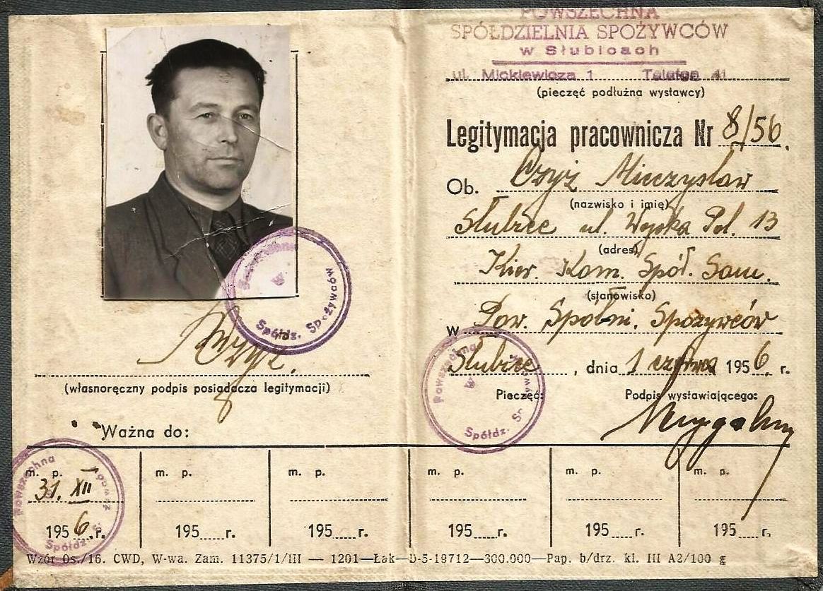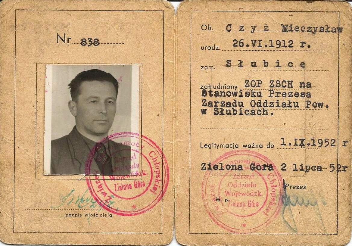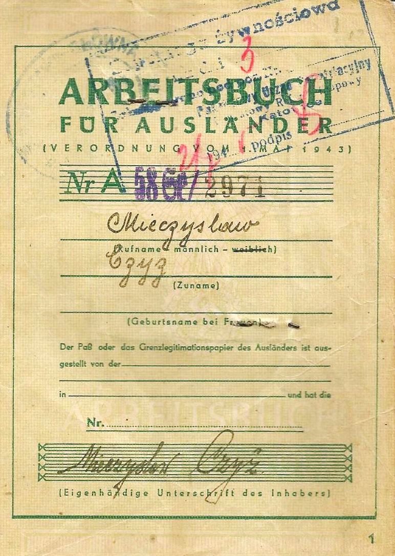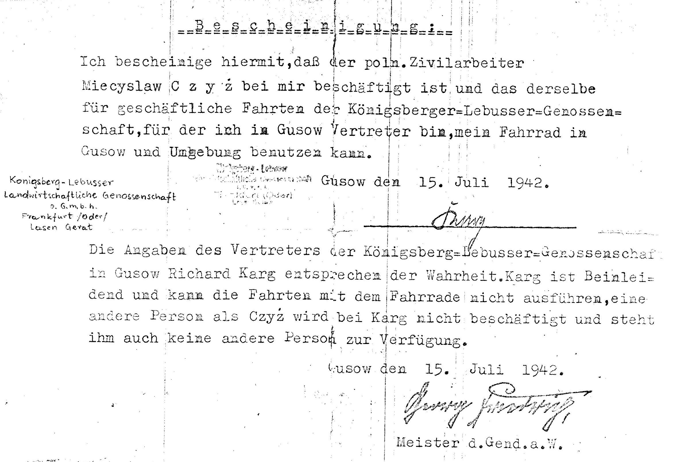 Z zaświadczenia wydanego 15 lipca 1942 r. wynika, że Mieczysław Czyż zatrudniony był w chojeńsko-lebuskiej spółdzielni rolniczej Königsberg-Lebuser Landwirtschaftliche Genossenschaft eGmBH we Frankfurcie nad Odrą i w tym celu mógł korzystać z roweru. Było to dość ekskluzywne jak na robotnika przymusowego prawo wojenne do poruszania się rowerem, co dodatkowo poświadcza policja porządkowa z odpowiednimi pieczęciami urzędowymi spółdzielni i Ortspolizei. Poświadczenia oraz przedłużenia na odwrocie pisma do się tym zaświadczeniem noszą daty 8 sierpnia 1942 oraz 12 lipca 1944 r.